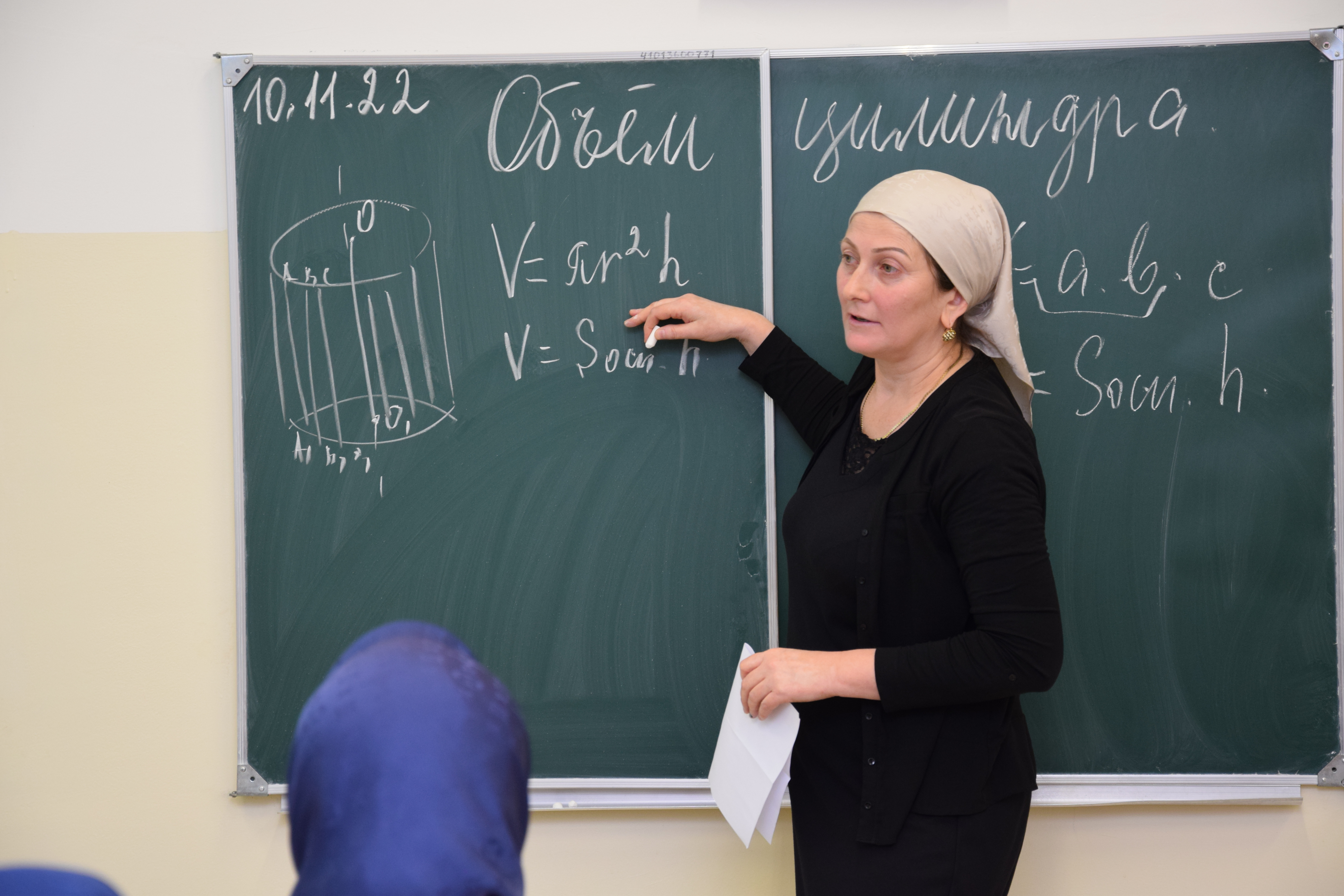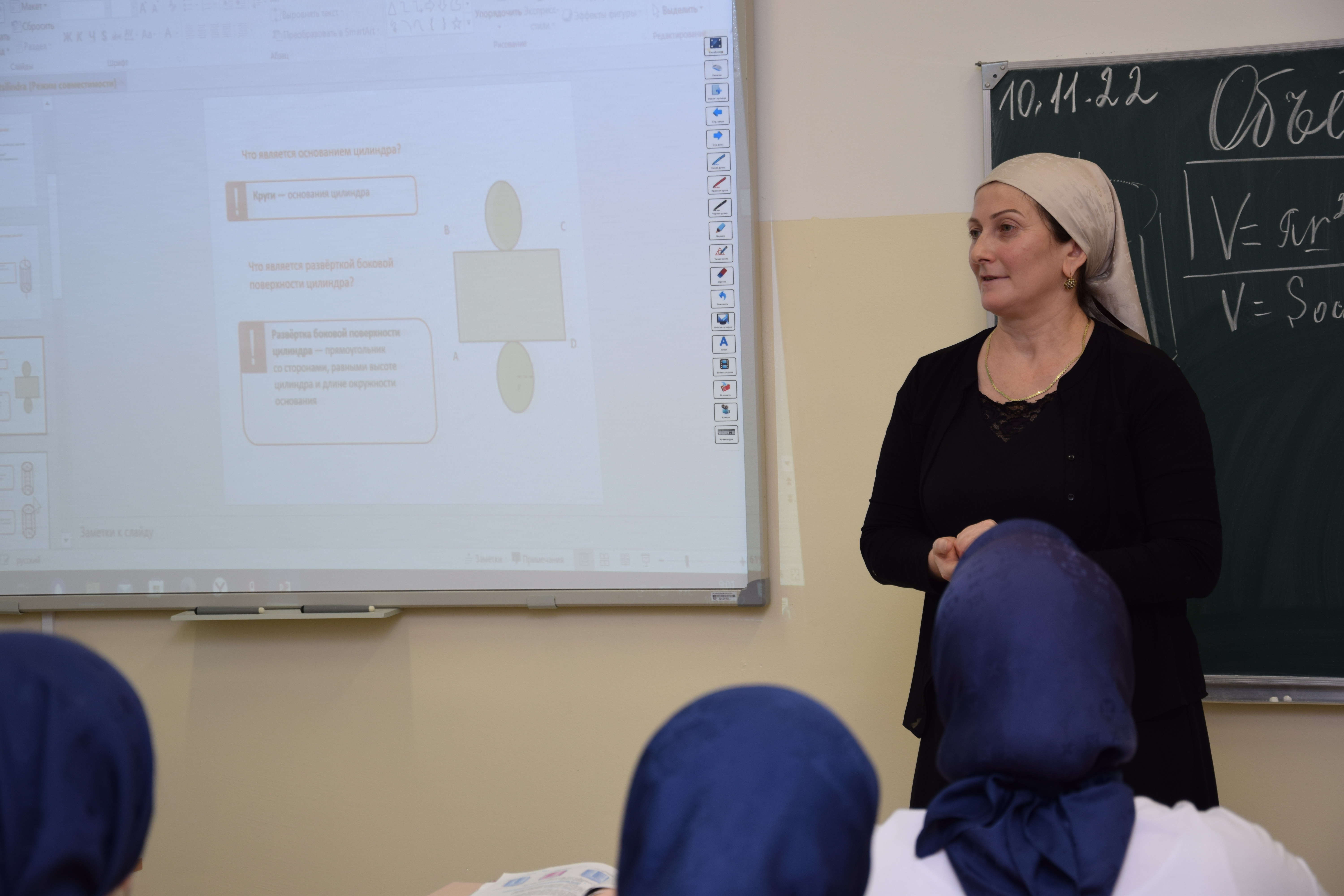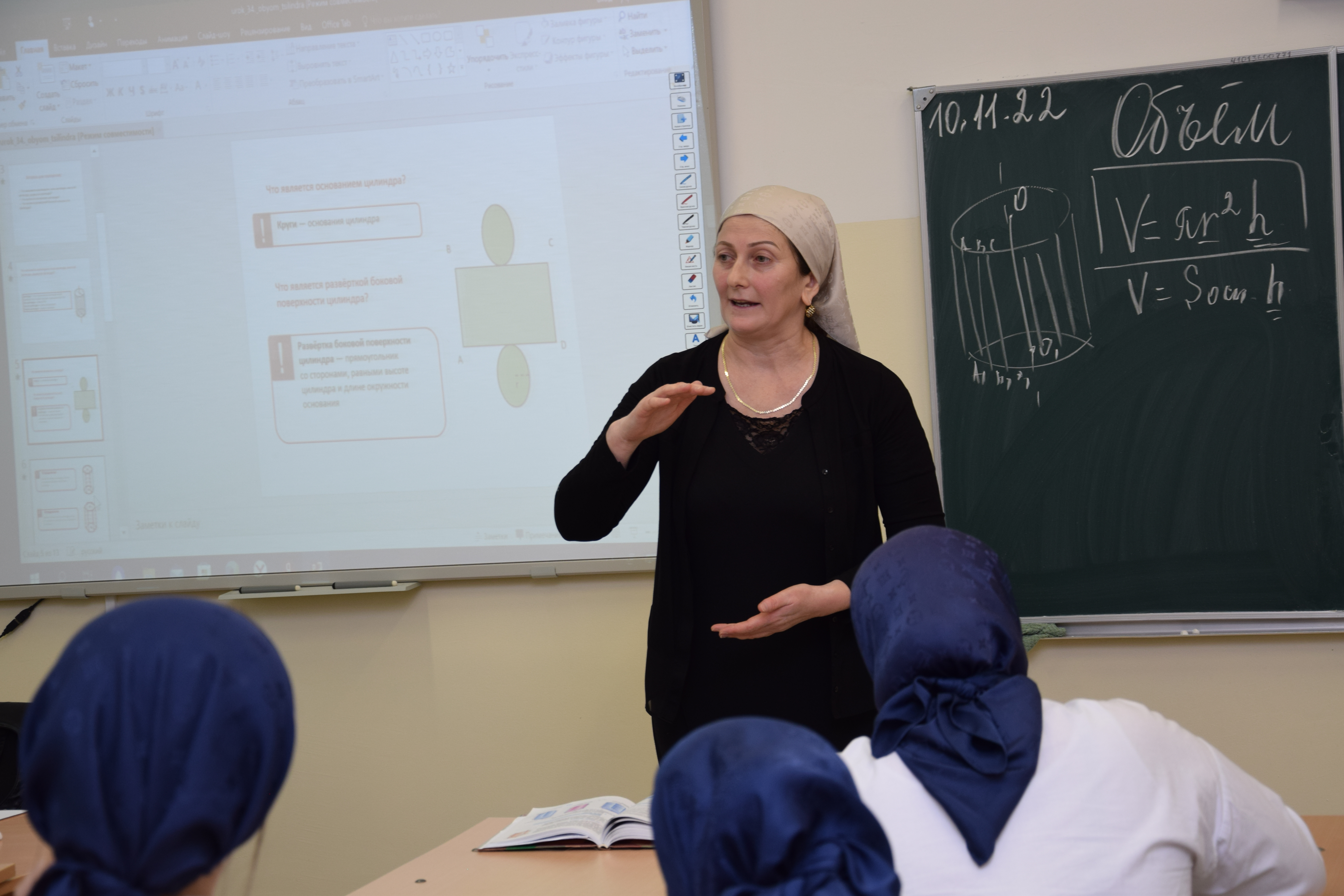 Согласно графику открытых уроков, утвержденному приказом №99 от 27.10.2022, в нашей школе учителем математики Бичуевой З. Д. был проведен урок математики в 11 классе на тему "Объем цилиндра".